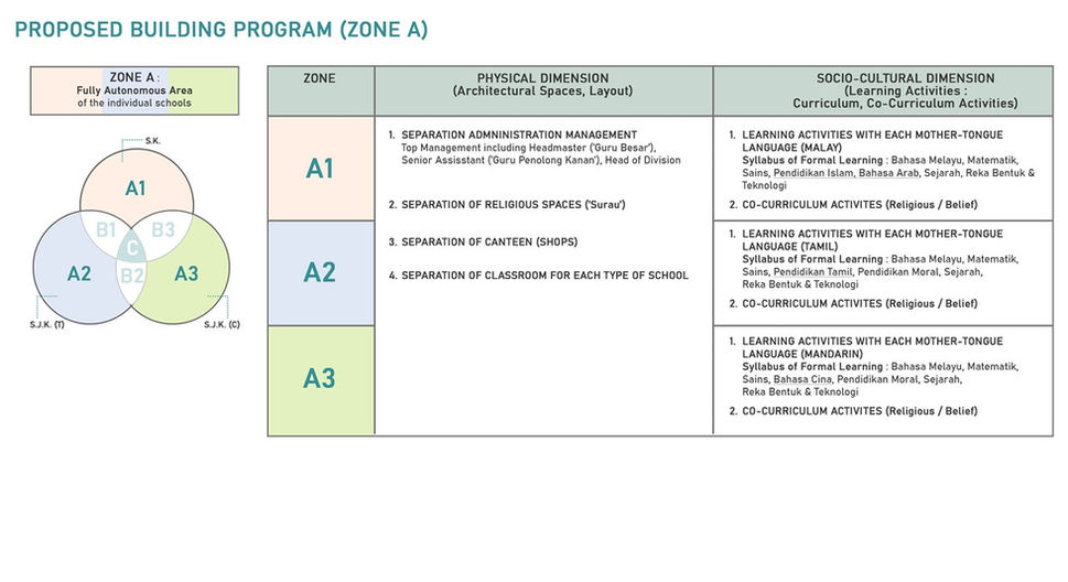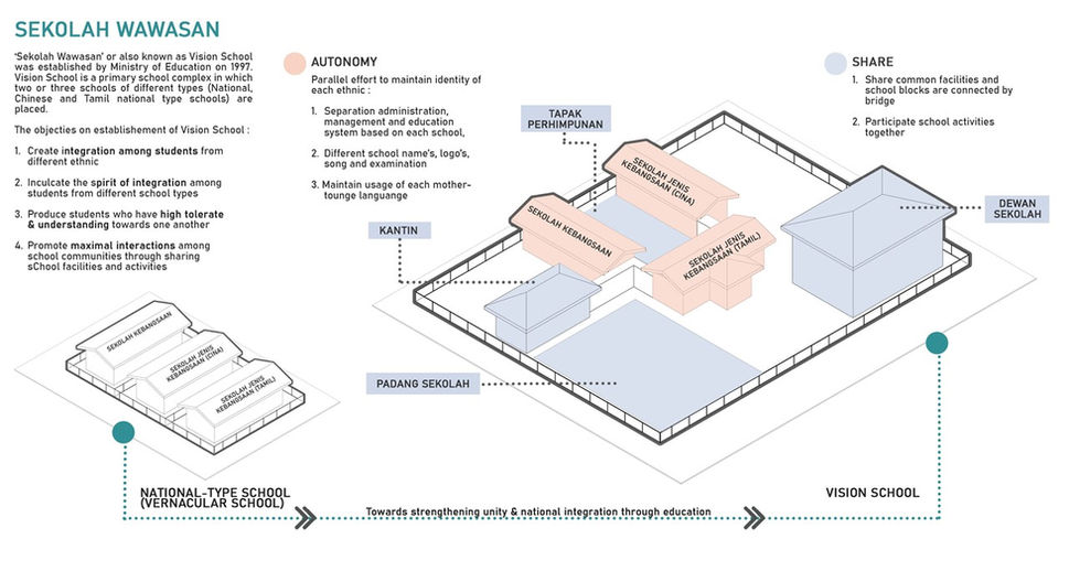 The 'Vision School' (Sekolah Wawasan) is a school redesigned in establishing racial integration among students in Malaysia by promoting maximal physical and social interaction among school communities. It is a primary school complex which housed two or three primary vernacular school (Malay, Chinese and Tamil) in one compound by sharing common school facilities. Past literature reviews found existing education policy of 'Vision School' has limiting the success rate on achieving the main objectives of its establishment and also has been reflected onto school design and planning.